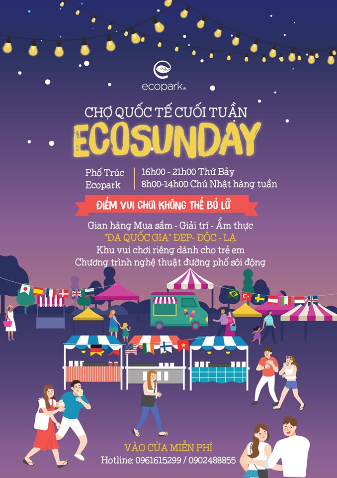 Từ 18/10/2019, thì phiên chọ cuối tuần EcoSunday sẽ được tổ chức thường xuyên từ 17:00 đến 22:00 thứ 6, 7 và 8:00 đến 14:00 Chủ Nhật hàng tuần.