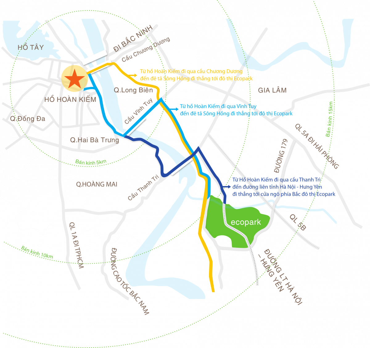 2. Hồ Gươm => Cầu Vĩnh Tuy => Đê Sông Hồng => đường Liên tỉnh Hà Nội – Hưng Yên => Ecopark